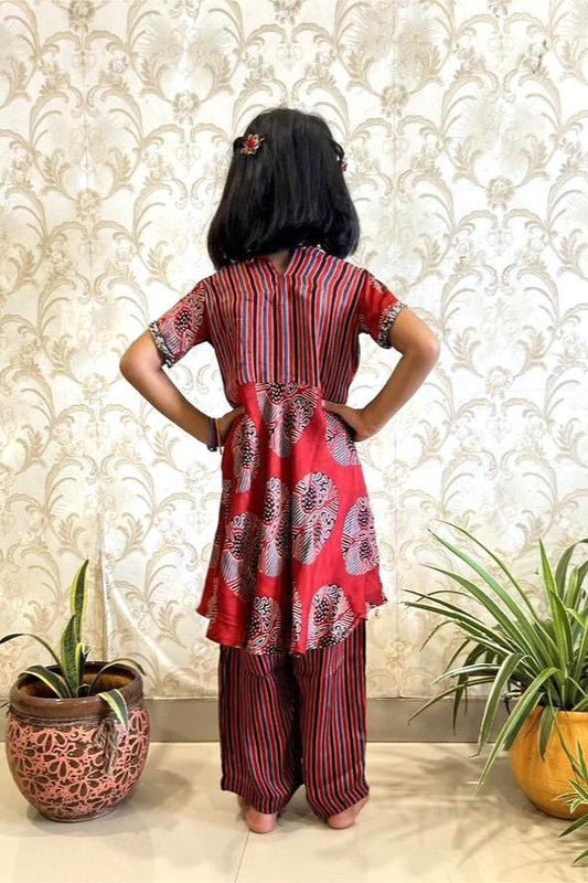 Girls's Kurta Set in Hand Block print & Pure Silk |Red