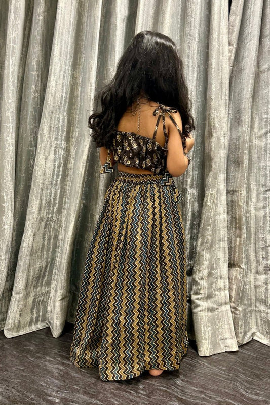 Girls's Lehenga Set in Hand Block print & Pure Silk |Brown