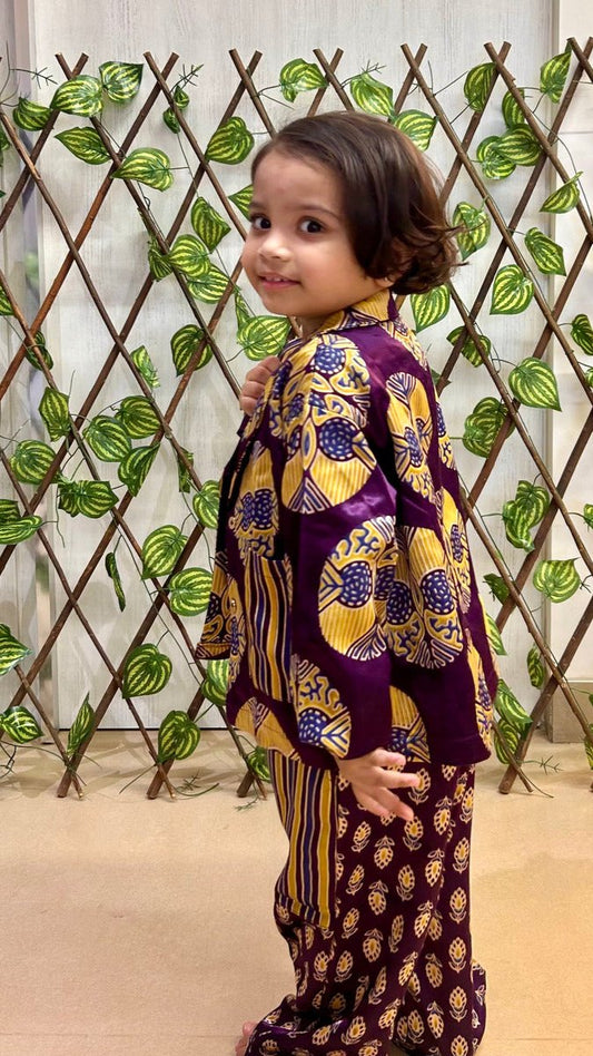 Girls's three peice Blazer Set in Hand Block print & Pure Silk |Purple