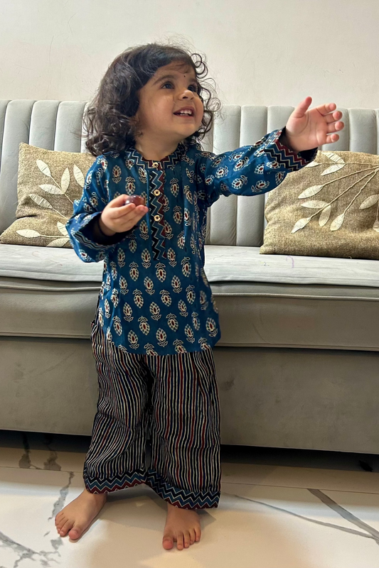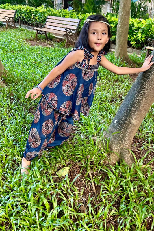 Girl's Dhoti Top Set in Hand Block print & Pure Silk |Blue