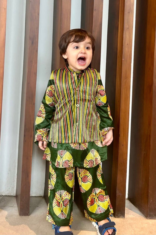 Unisex Kurta -Bandi Set in Hand Block Print & Pure Silk |Green